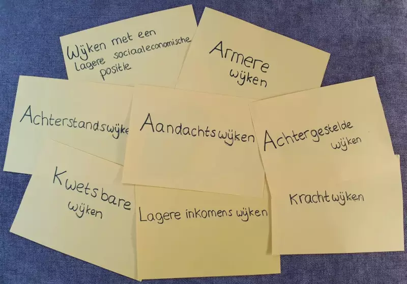 We leggen acht verschillende termen voor aan onze adviesgroepleden: armere wijk, wijk met een lagere sociaaleconomische positie, kwetsbare wijk, aandachtswijk, achterstandswijk, achtergestelde wijk, lagere inkomenswijk en krachtwijk. Bijna allemaal worden ze binnen een paar tellen afgeschoten.
