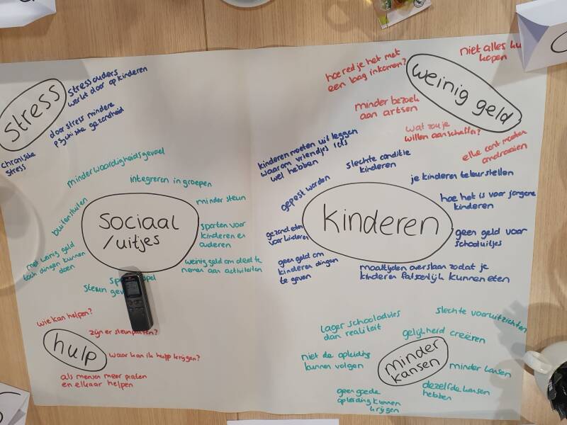 ‘Nou, ik heb het aan mijn zoon gevraagd,’ geeft één van de adviesgroepleden aan. Zelf is ze namelijk niet opgegroeid in armoede maar er pas later in terechtgekomen. Dus ze vroeg het degene in haar directe omgeving die hier de meeste (ervarings)kennis over heeft. Het werd een onthullend gesprek met haar inmiddels volwassen zoon. Zo had ze niet verwacht dat hij vroeger zoveel stress had ervaren van hun thuissituatie. Verder gaf hij toe dat hij het verborgen probeerde te houden als er schooluitjes waren, zodat hij zijn moeder niet lastig hoefde te vallen met de kosten. Dit heeft ze nooit gemerkt; ze was destijds zelfs opgelucht dat er weinig uitjes waren waarvoor betaald moest worden.