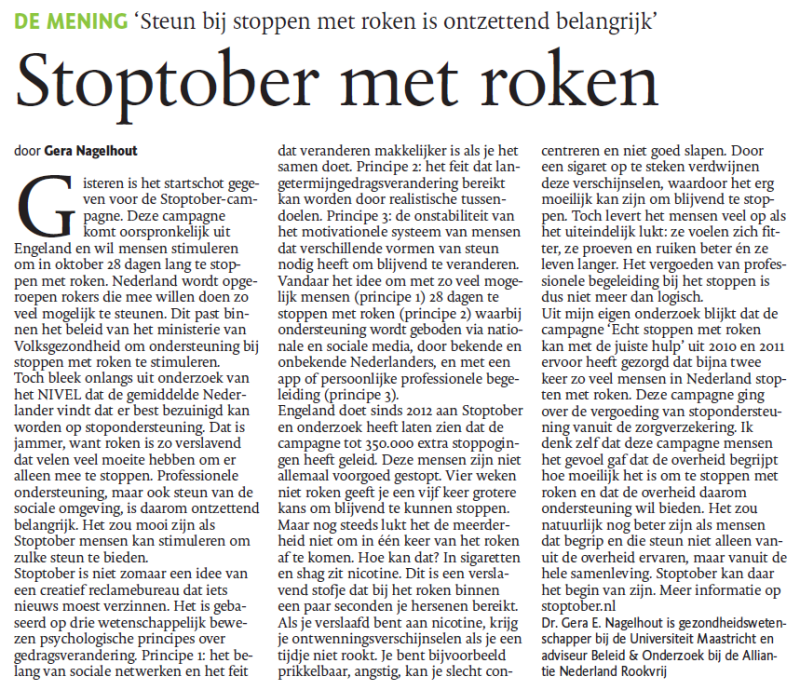 Gisteren is het startschot gegeven voor de Stoptober-campagne. Deze campagne komt oorspronkelijk uit Engeland en wil mensen stimuleren om in oktober 28 dagen lang te stoppen met roken. Nederland wordt opgeroepen om rokers die mee willen doen zoveel mogelijk te steunen. Dit past binnen het beleid van het Ministerie van Volksgezondheid om ondersteuning bij stoppen met roken te stimuleren en te vergoeden. Toch bleek vorige maand uit onderzoek van het NIVEL dat de gemiddelde Nederlander vindt dat er best bezuinigd kan worden op stopondersteuning. Dat is jammer, want roken is zo verslavend dat velen veel moeite hebben om er alleen mee te stoppen. Professionele ondersteuning, maar ook steun van de sociale omgeving, is daarom ontzettend belangrijk. Het zou mooi zijn als Stoptober mensen kan stimuleren om zulke steun te bieden.