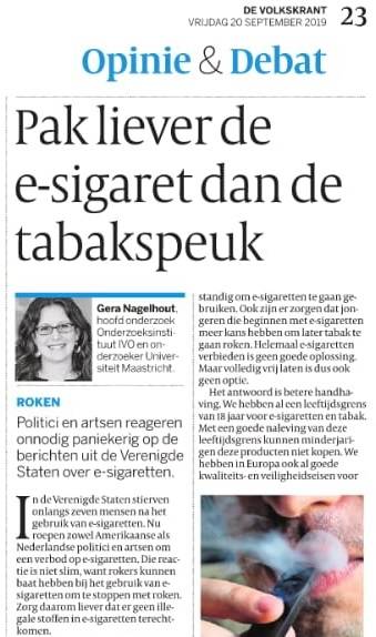 ALGEMEEN DAGBLAD - Bij de weekboodschappen voor de supermarkt kan sinds kort géén pakje sigaretten meer op het lijstje. Rokers kunnen alleen nog terecht bij tankstations en tabakszaken voor hun peuken en shag. Maar opmerkelijk genoeg gaat de vlag daar nog niet uit. Voor hoogleraar gezondheidsonderzoek aan de Universiteit Maastricht Gera Nagelhout is het nieuwe koopgedrag juist positief. „We zien in wetenschappelijke onderzoeken dat hoge accijns goed werkt. Mensen minderen of stoppen, en jongeren beginnen er niet aan.” Doordat supermarkten geen sigaretten meer mogen verkopen, gaan er zo’n 6000 verkooppunten voor tabak weg. Eerder bleek dat er in Utrecht een aantal tabaksspeciaalzaken bij kwamen, maar volgens Nagelhout weegt dit niet op tegen de verdwijning van de verkooppunten in supermarkten. https://www.ad.nl/utrecht/drukte-bij-tabakszaken-toch-werkt-de-nieuwe-regelgeving-niet-in-hun-voordeel~af856d44/?cb=e2959a36-792d-4cb2-a3a2-17487e0345b1&%3Bauth_rd=1&auth_rd=1