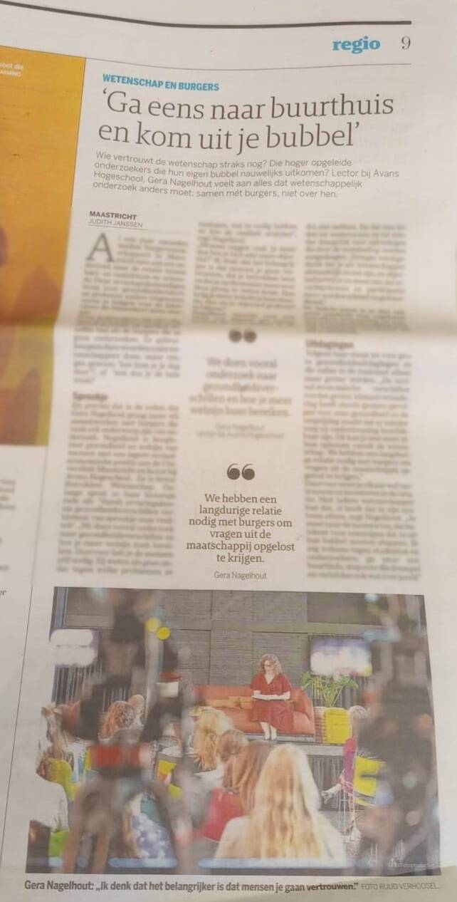 DE LIMBURGER - Wie vertrouwt de wetenschap straks nog? Die hoger opgeleide onderzoekers, die hun eigen bubbel nauwelijks uitkomen? Lector bij Avans Hogeschool, Gera Nagelhout voelt aan alles dat wetenschappelijk onderzoek anders moet: samen mét burgers, niet over hen. Ze is lector Betrokken Wetenschap. Onlangs sprak ze haar lectorale rede uit ‘Vanuit ervaringskennis gezondheidsverschillen verkleinen: van sprookje naar realiteit’. https://www.limburger.nl/regio/limburg/wetenschapper-gera-nagelhout-zegt-weleens-tegen-haar-studenten-ga-eens-naar-een-buurthuis-kom-uit-je-bubbel/72903522.html