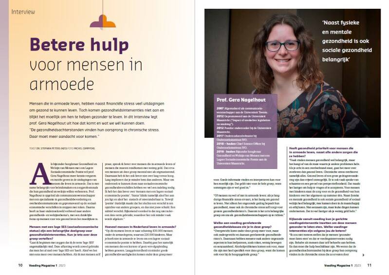 VOEDING MAGAZINE - Mensen die in armoede leven, hebben naast financiële stress veel uitdagingen om gezond te kunnen leven. Toch komen gezondheidsinterventies niet aan en blijkt het moeilijk om hen te helpen gezonder te leven. In dit interview legt prof. Gera Nagelhout uit hoe dat komt en wat we wél kunnen doen. "De gezondheidsachterstanden vinden hun oorsprong in chronische stress. Daar moet meer aandacht voor komen." https://www.researchgate.net/publication/371856402_Betere_hulp_voor_mensen_met_armoede_MUST_READ_voor_food_professionals_Interview_profdr_Gera_Nagelhout_Universiteit_Maastricht